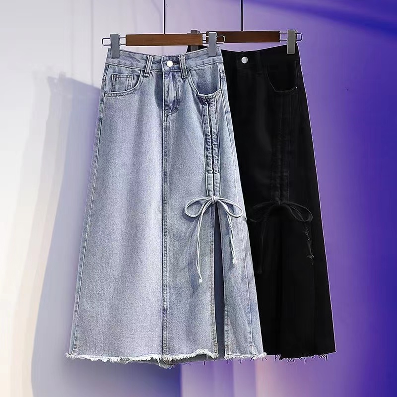 レディース デニムスカート ロング ダメージ加工 春夏 ポケット ハイウエスト ゆったり ナチュラル 可愛い 黒 ブラック ライトブルー 青 ハイウエストデニムスカート スカート 大人可愛い かわいい