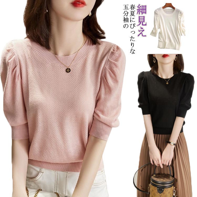 サマーニット ニット パワショル ニット セーター クルーネック パフスリーブ パワショルニットレディースファッション トップス ニット セーター セーター