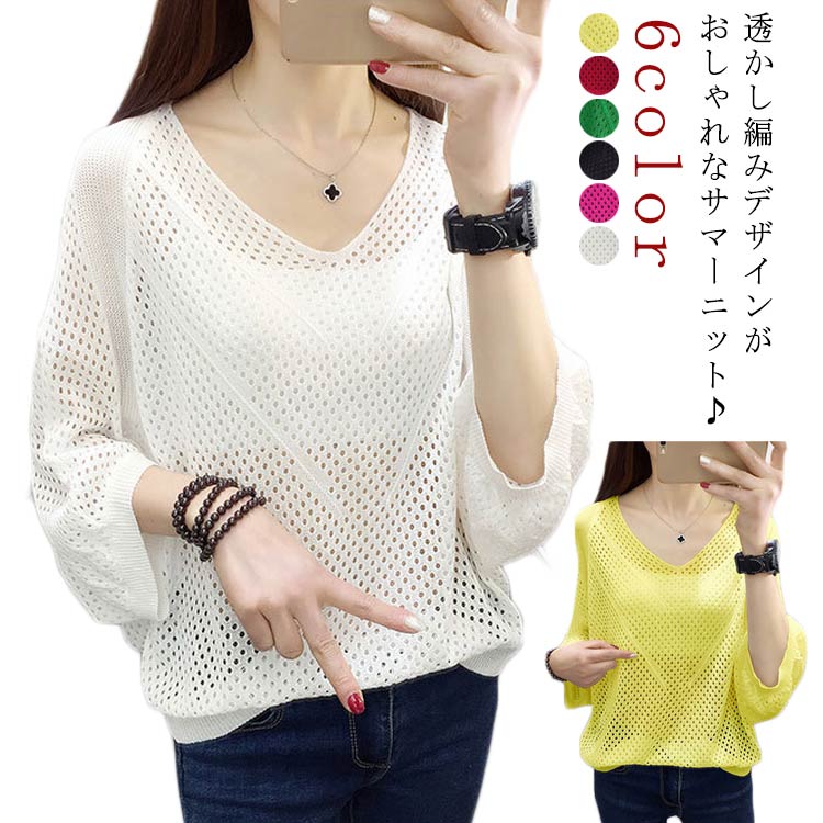 ニットサマーニット 7分袖 レディース ドルマンスリーブサマーニット トップス ドルマン 50代 透かし編み 20代 30代 40代 透かし編みドルマンサマーニット