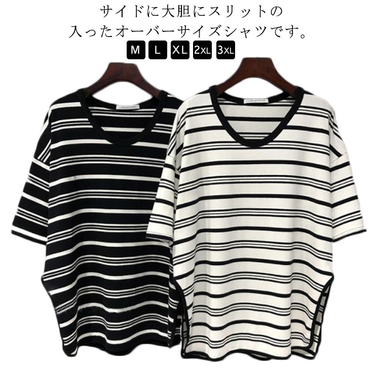 チュニック ワンピース 体型カバー ボーダー柄 スリット目 ボートネック 通学 ゆったり トップス 夏 レディース 大きい プルオーバー カジュアルコーデ ロングTシャツ 流行 秋 ファッション 通勤
