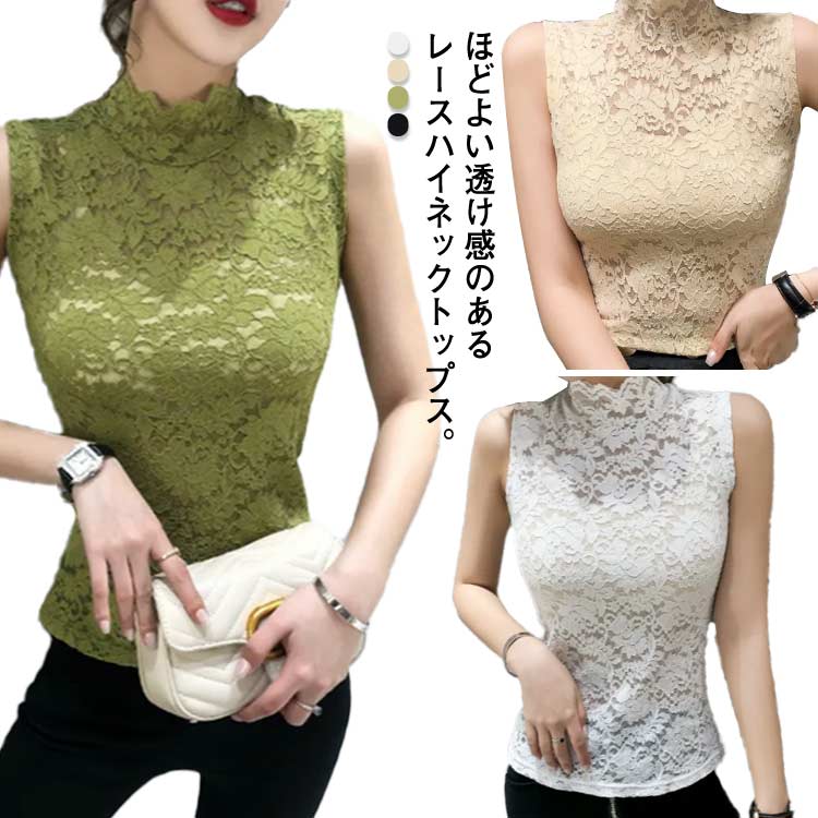 カジュアル タンクトップ レディース トップス レース ノースリーブ ハイネック シアートップス インナー 薄手 刺繍 レイヤード 重ね着 かわいい 透け感