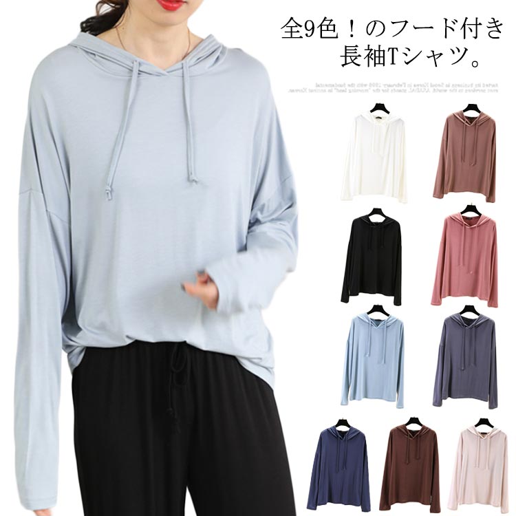 フード付き tシャツ パーカー 長袖 プルオーバー 春 夏 秋 カットソー 大きサイズ 伸縮性レディースファッション トップス Tシャツ カットソー