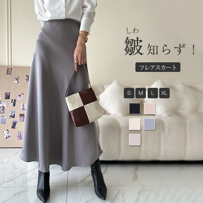 コーディネート自在のサテン地シンプルロングフレアスカート ベーシック 着回し力 オフィスカジュアル スタイルアップ 縦長 高見え