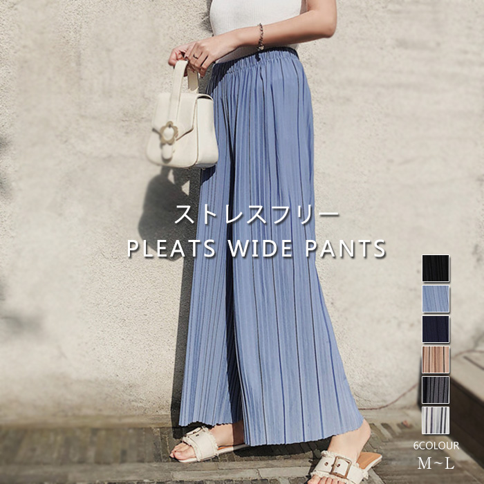 全6色 接触冷感 プリーツ風 プリーツワイドパンツ グレー ネイビー ブラック 黒 ブルー ベージュ 大きいサイズ リゾート 通勤 通学 デート お家 ママコーデ ♪