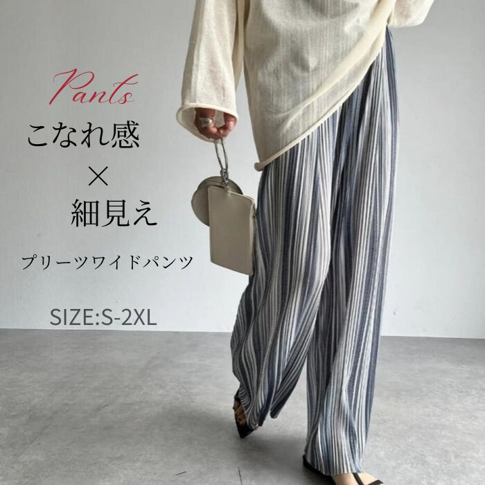 全6色 接触冷感 プリーツ風 プリーツワイドパンツ Summer Pants グレー ネイビー ブラック 黒 ブルー ベージュ 大きいサイズ リゾート 通勤 通学 デート お家 ママコーデ ♪