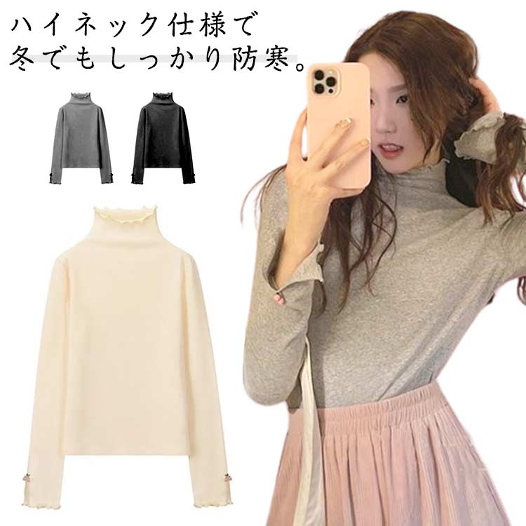 ロングシャツ Tシャツレディース 可愛い 無地 Tシャツレディース チェリー フリル ハイネック トップス オフホワイト 長袖