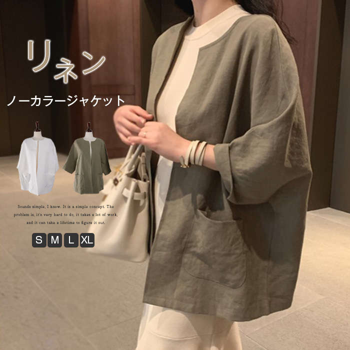 大人気~ 綿麻素材 ノーカラージャケット Linen Jacket 大きいサイズ ホワイト 白 プレゼント 贈り物 ギフト 母の日 フォーマル 通勤 オフィス OL 普段 デート ママ 母 母親 ♪