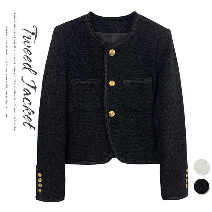 大人気~春秋のオトナコーデにぴったり ツイードノーカラージャケット Tweed jacket 20代 30代 40代 50代 ブラック 黒 ホワイト 白 春 秋 冬 入学式 卒業式 入園式 卒園式 ♪