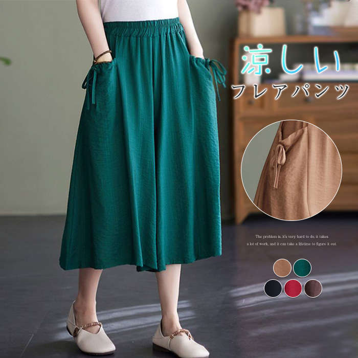 リラックスウエア~ 綿麻 フレアパンツ レッド 赤 グリーン 緑 ブラック 黒 ベージュ コーヒー色 ♪