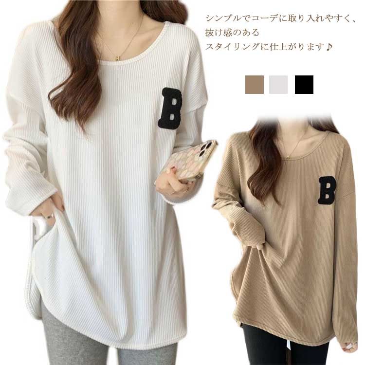 スリット ラウンドヘム レディース リブ オーバーサイズ 春 体型カバー シャツ カジュアル カットソー ロゴ プリント ロン ロンティー 秋 白 黒 白 ゆったり 大きいサイズ ビッグシルエット