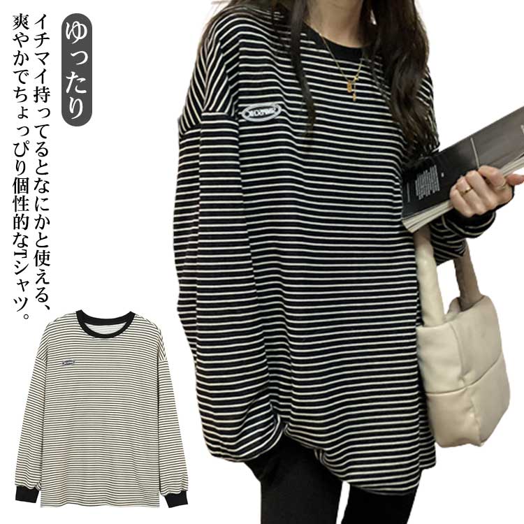 ボーダー プルオーバー カットソー トップス 長袖 春 大きいサイズ シャツ カジュアル ゆったり 30代 女性 20代 40代 ファッション 韓国 クルーネック ドロップショルダー スウェット レ