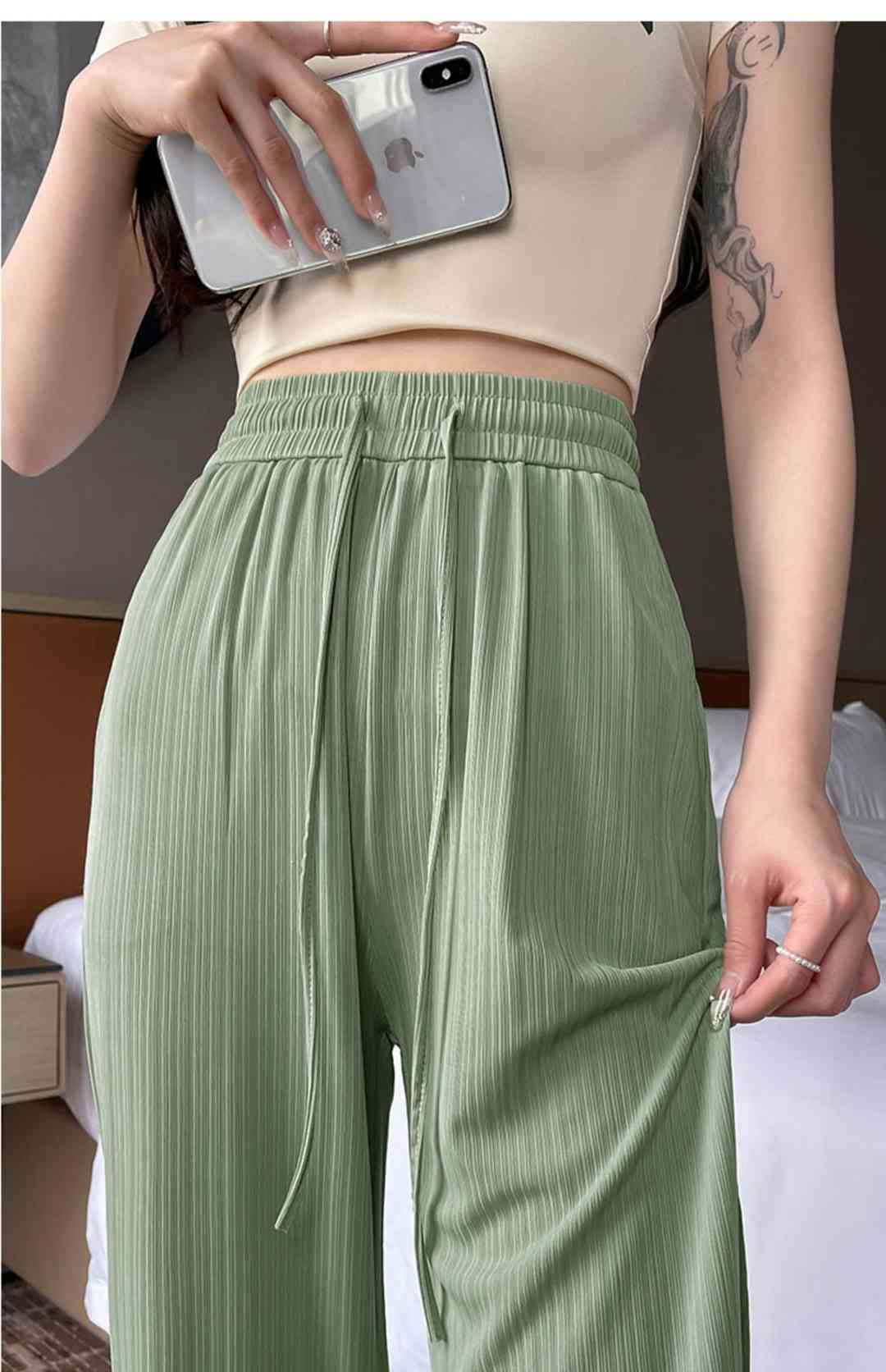 ワイドパンツ レディース 夏 リブ ロングパンツ 冷感 アイスシルクパンツ ウエストゴム ロング丈 涼しい パンツ 着痩せ カジュアル