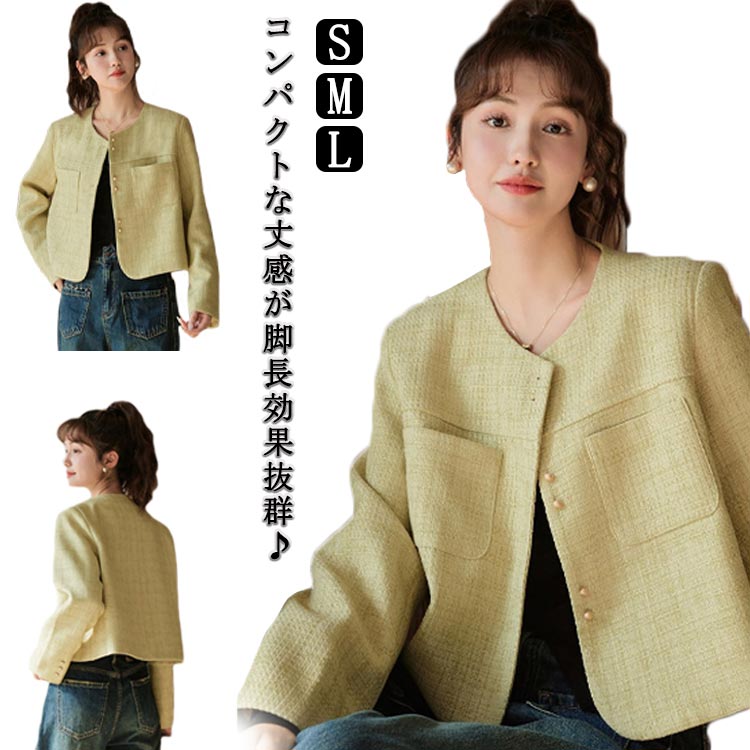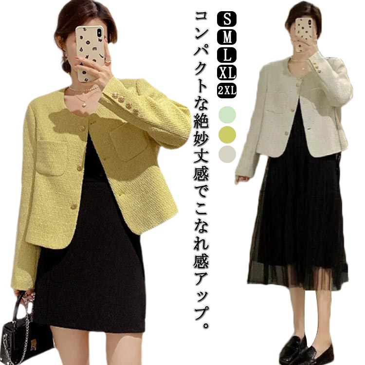 ノーカラージャケット 20代 ツイードジャケット 30代 ショート丈 ジャケット アウター 羽織り 結婚式 発表会 フォーマル オフィス カジュアル OL お出かけ 通勤