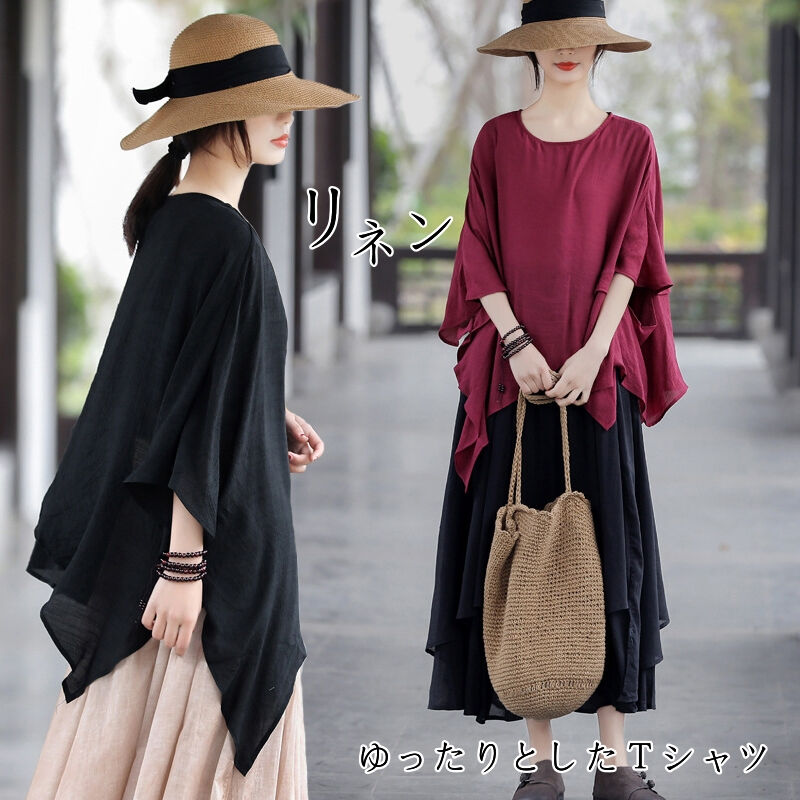綿麻風 tシャツ レディース リネン トップス ロング インナー シンプル オーバーサイズ 大きいサイズ ゆったり 春 夏 大人 お洒落 重ね着 レイヤード 着痩せ 無地 部屋着 30代 40代 50