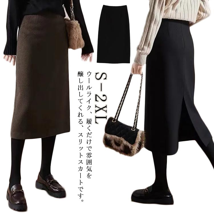 スカート タイトスカート カジュアル おしゃれ スリットスカート ロングスカート ミモレ丈 ウールライク
