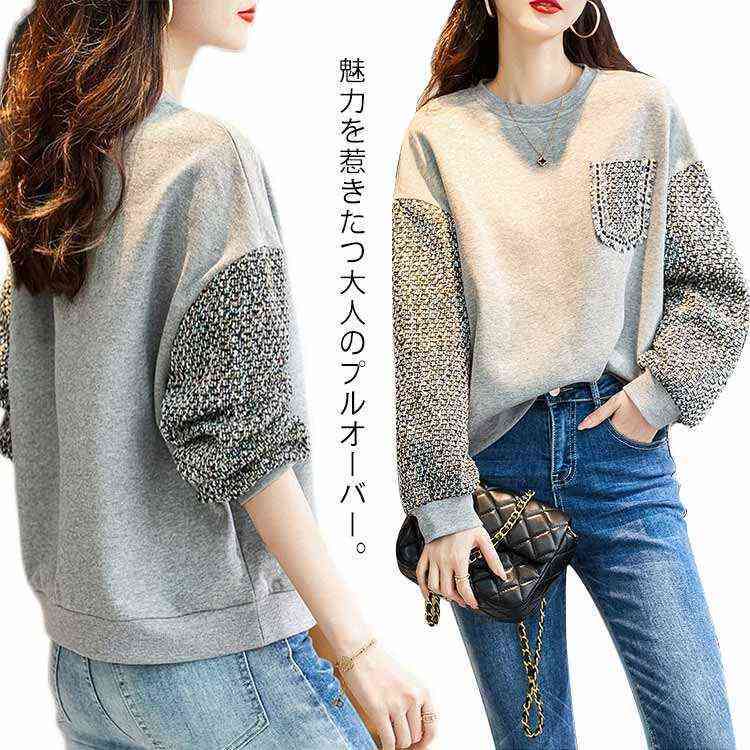 スウェット 大きいサイズ プルオーバー トップス レディース オーバーサイズ ゆる トレーナー 秋 春服 胸ポケット ツイード切り替え
