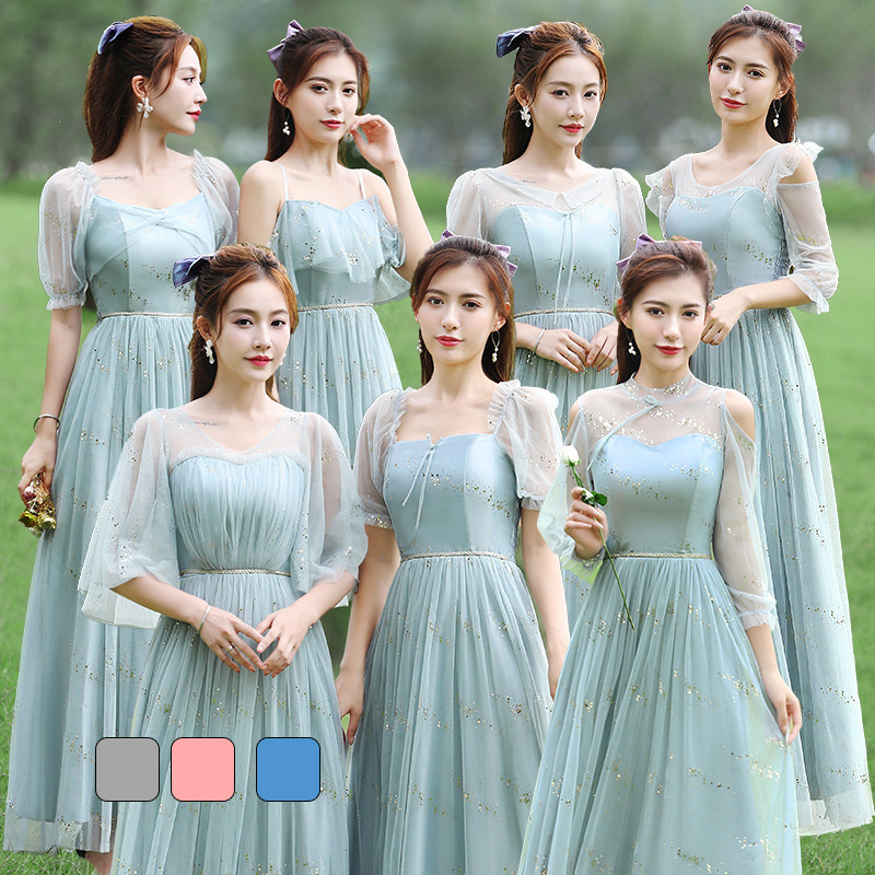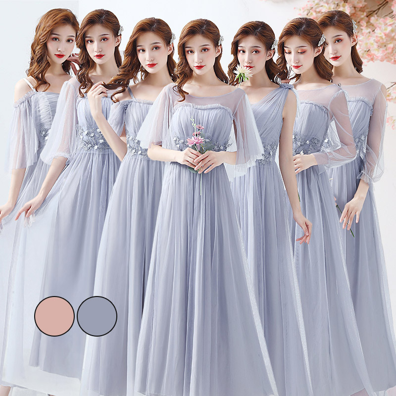 ロングドレス ブライズメイド ドレス ピンク グレー フリーサイズ ひざ下丈ドレスミディアム丈ドレス ひざ下丈 フォーマルドレス パーティードレス Aライン フレア 結婚式 ワンピース マキシ丈ロング