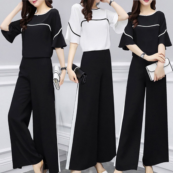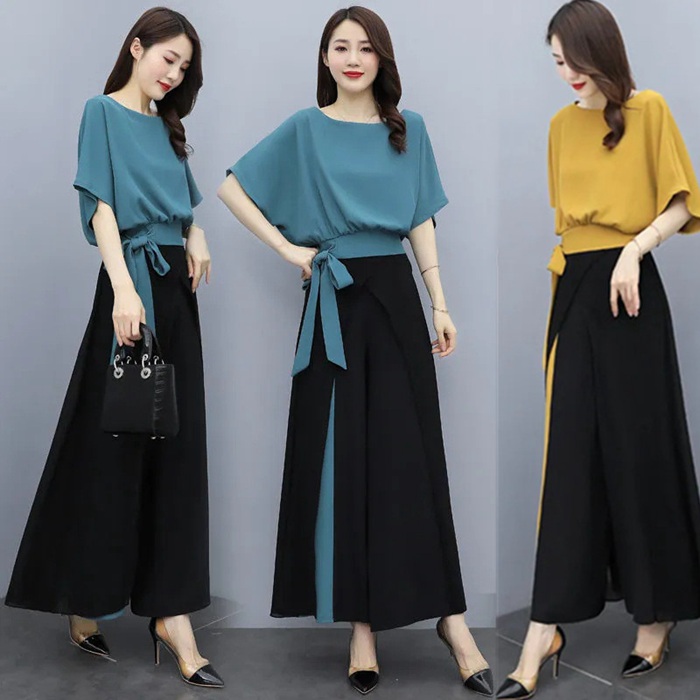 セットアップ 上下セット レディース ブラウス ワイトパンツ ガウチョパンツ 半袖 ロング丈 パンツ 通勤 OL トップス ボトムス 着痩せ ファッション おしゃれ カジュアル 夏