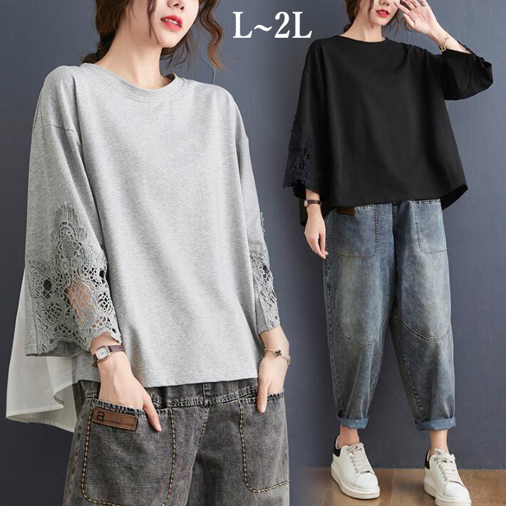 Tシャツレディース大きいサイズ夏レース花柄刺繍ロングTシャツゆるTシャツ チュニック前後差半袖ロングクルーネック切替ビッグシルエットL2L
