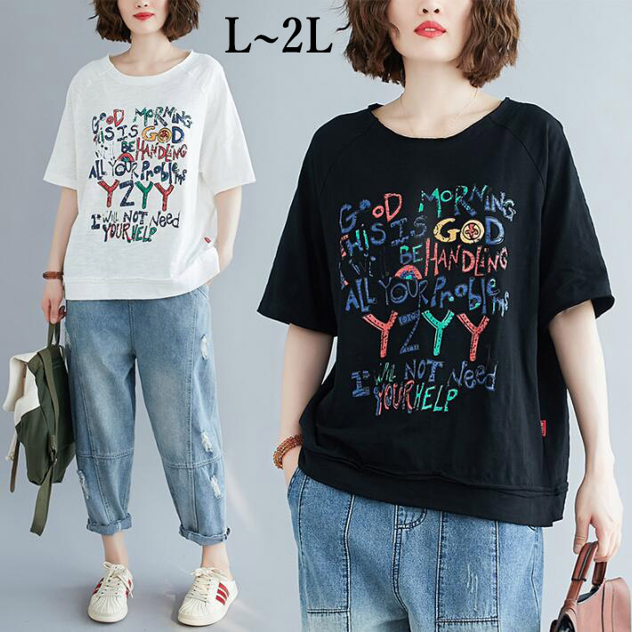 Tシャツレディース大きいサイズ半袖夏ロゴプリント綿コットンチュニック クルーネック 大きいサイズ ゆったり L2L