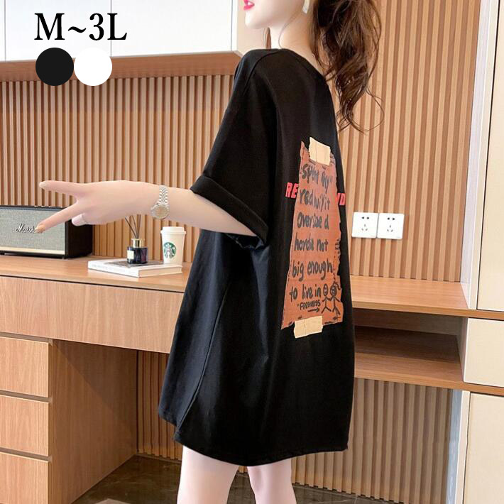 Tシャツ オーバーサイズ ゆったりTシャツロングTシャツトップス Tシャツロゴ半袖チュニック大きいサイズクルーネックビッグT体型カバーレディース夏ML 2L3L
