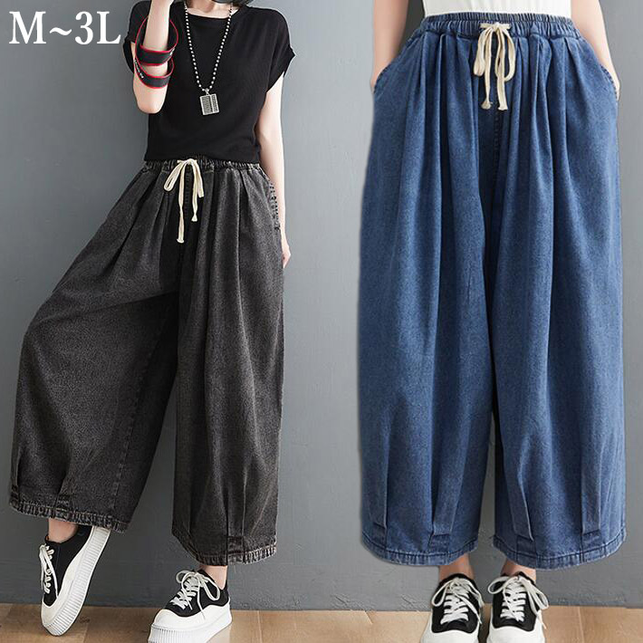 パンツレディース 大きいサイズバルーンパンツサーカスパンツ サルエルパンツボリュームパンツ ウエストゴムデニム9分丈ロング体型カバーM L2L3L