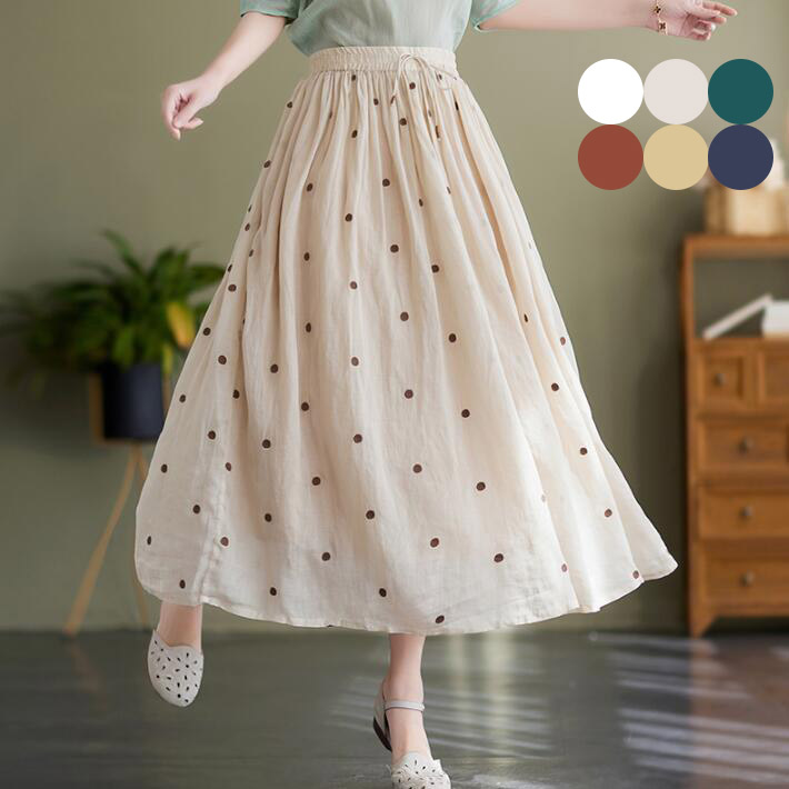 スカートフレアリネン綿麻ウエストゴムドット水玉ミモレ丈 ハイウエスト レディース ラインボトムスパーティ フォマール女子会カジュアル春夏2
