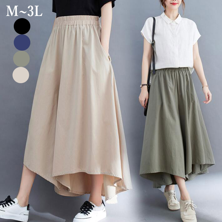 ガウチョパンツレディースワイドパンツスカンツ スカーチョロングパンツ前後差フレア ふんわりスカチョウエストゴム麻混きれいめ大きいサイズ春夏ML2L3L