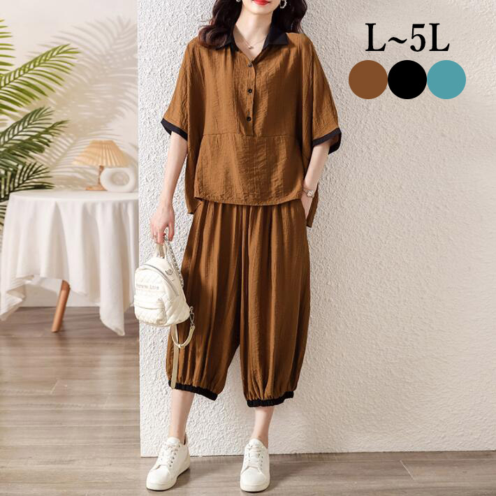 2点セットセットアップトップスボトムスブラウスパンツサーカスパンツ ボリュームパンツサルエルパンツフィッシュテールウエストゴム半袖レディース楽チン大きいサイズ 夏