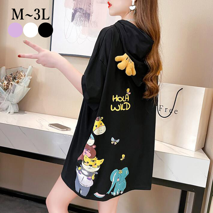 TシャツレディースロングTシャツ パーカーオーバーサイズ フード付きトップス ロゴプリント半袖 チュニック大きいサイズクルーネックビッグシルエットかわいいML 2L3L