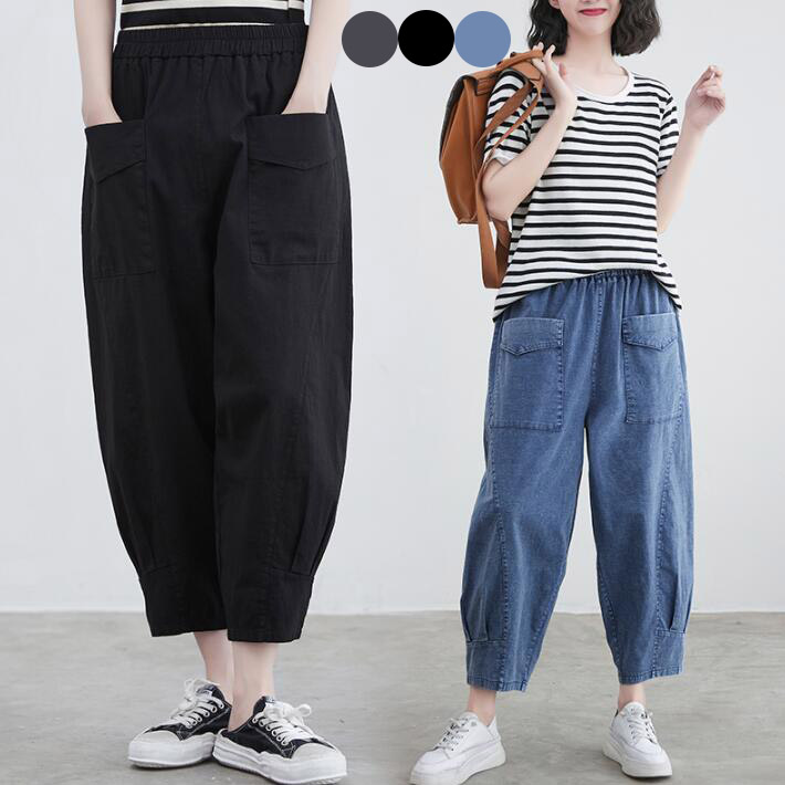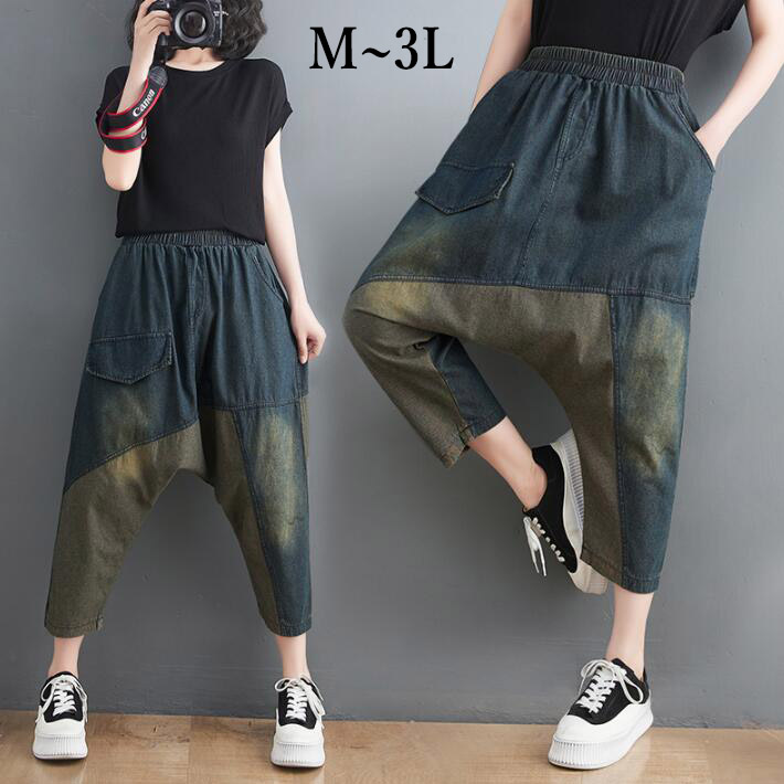パンツ レディース 大きいサイズデニムパンツサルエルパンツ ウエストゴムボトムス ズボンゆるパン大きめ変形春夏ML2L3L