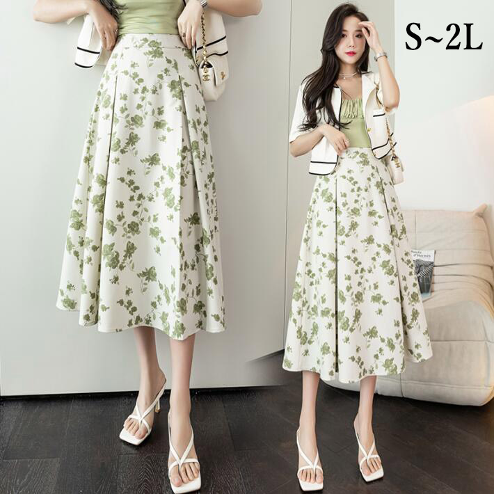 フラワースカートプリーツスカート ミモレ丈スカートフレア裏地付きAライン花柄スカートロングスカート ミモレ丈きれいめフェミニン春夏秋 SML2L