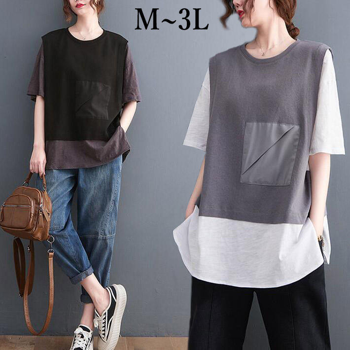 Tシャツレディース半袖夏大きいサイズ切替ロングTシャツカットソーオーバーサイズトップス クルーネック体型カバー シンプルカジュアル夏ML2L3L