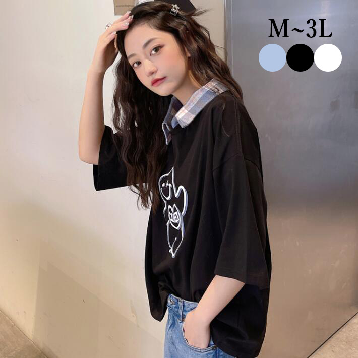 Tシャツレディース大きいサイズ夏半袖切替 ゆったりTシャツロングTシャツトップスプリントチェックチュニッククルーネックビッグシルエット体型カバーML2L3L