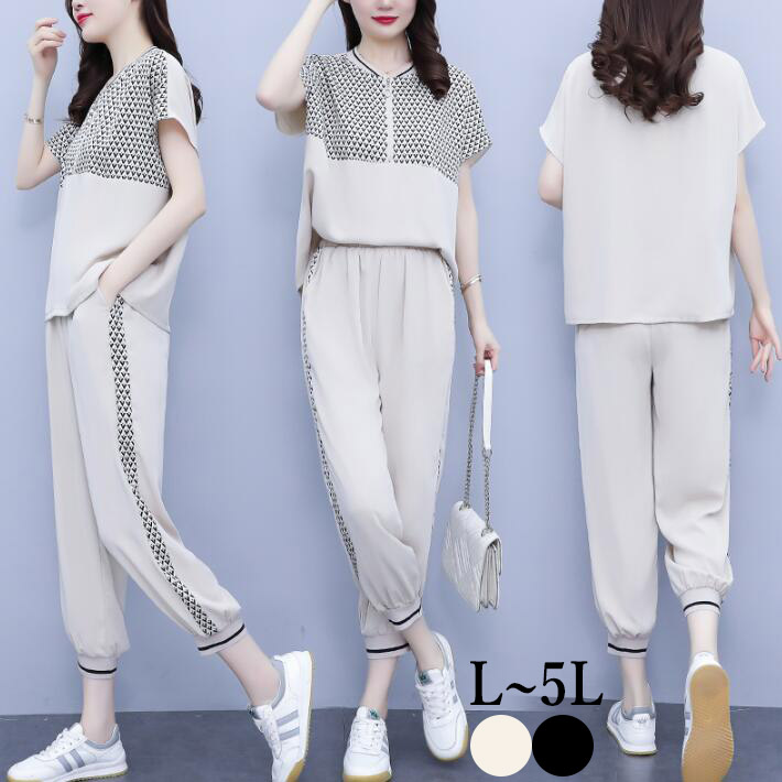セットアップ2点セットブラウスパンツトップスボトムスジョガーパンツ半袖ウエストゴムレディースカジュアル大きいサイズ夏L2L3L4L5L