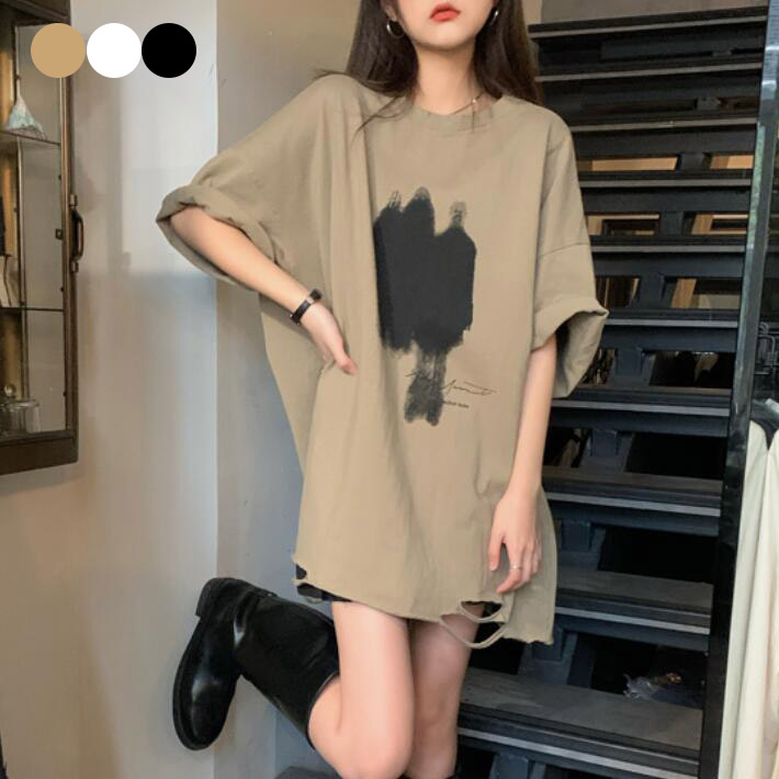 Tシャツレディース半袖ダメージコットンオーバーサイズ ゆるTロングTシャツ トップス ロゴプリントチュニック大きいサイズビッグシルエット夏