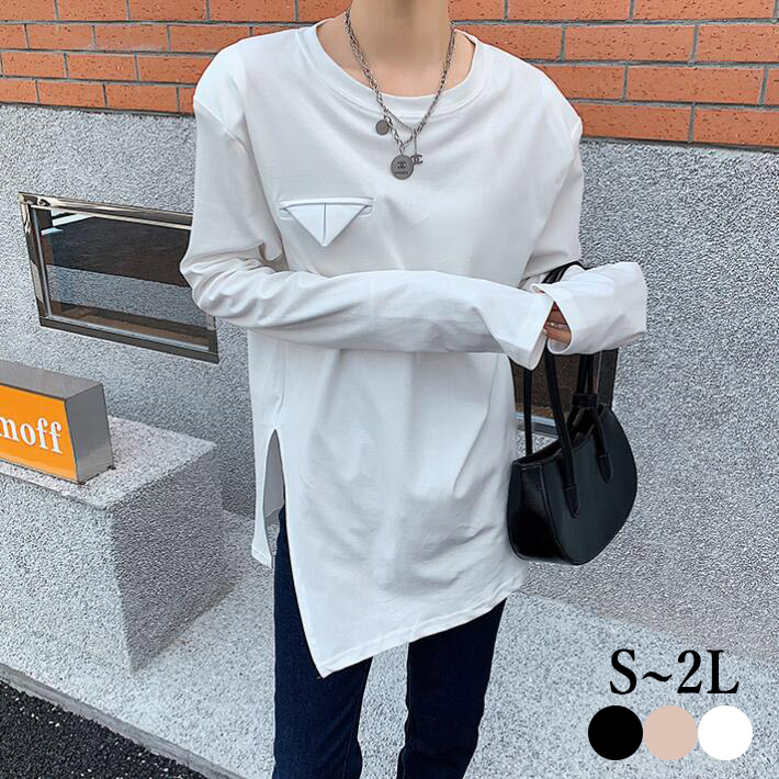 TシャツカットソーレディーススリットロングTシャツオーバーサイズ ゆったりTシャツ チュニック長袖大きいサイズ体型カバーオシャレ可愛い春秋SML2L