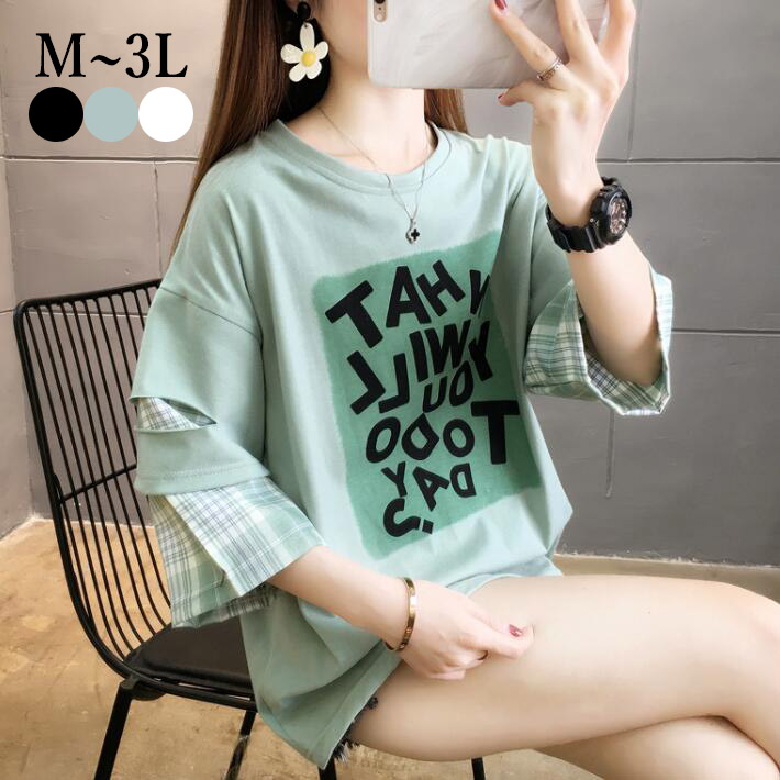 ダメージTシャツTシャツレディースダメージロゴプリント切替チェック ゆったりTシャツ チュニックカットソー半袖大きいサイズクルーネックビッグシルエットML2L3L