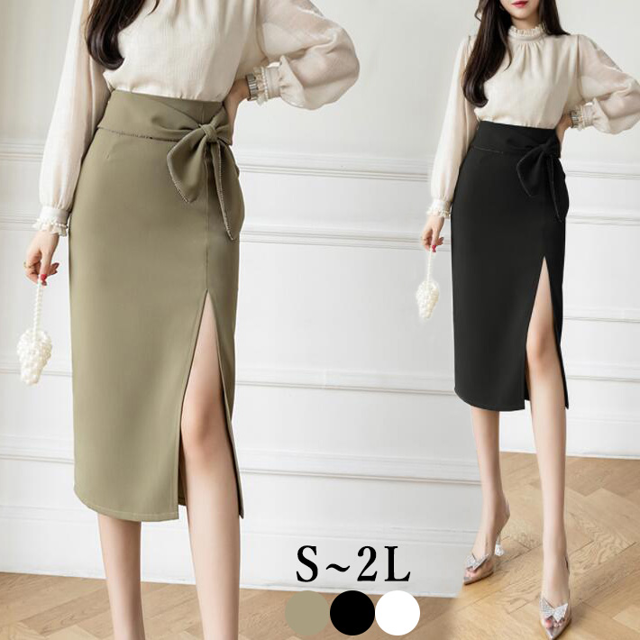 スカート タイトスカート スリットリボンひざ丈 ミモレ丈 ロング丈 セクシーオフィス カジュアルボトムス ハイウエスト S M L 2L