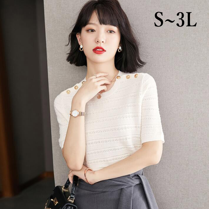 ニットレディース半袖大きいサイズおしゃれ半袖ニットキレイめセーター切替クルーネックトップス カジュアルシンプル ストレッチ春夏SML2L3L