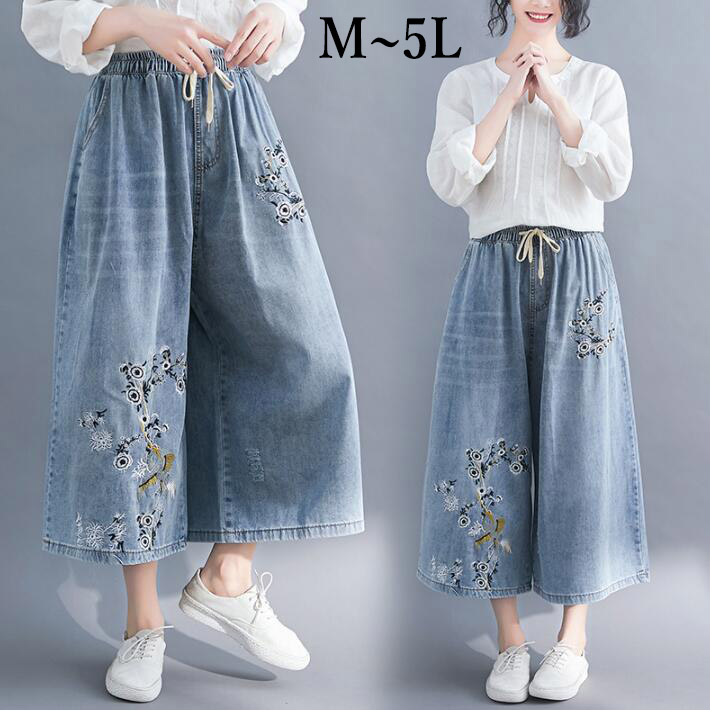 ワイドパンツガウチョパンツスカーチョレディース大きいサイズデニム刺繍花柄ワイドスリットウエストゴムカンツハイウェストオーバサイズ春夏ML2L3L4L5L
