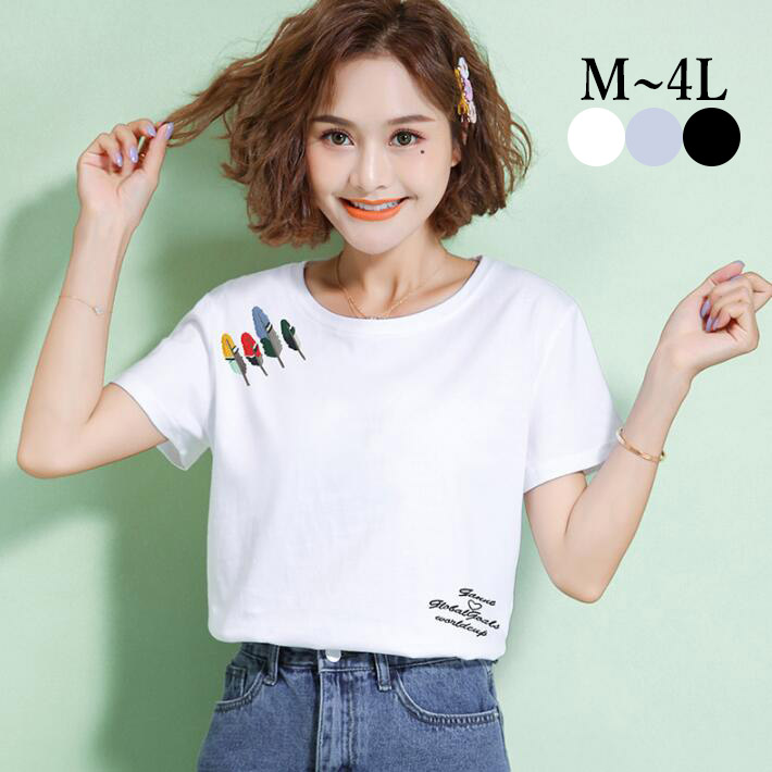 TシャツロゴT刺繍レディースオーバーサイズトップス 半袖チュニック大きいサイズクルーネックシンプル無地春夏ブラックホワイトグレーML 2L3L