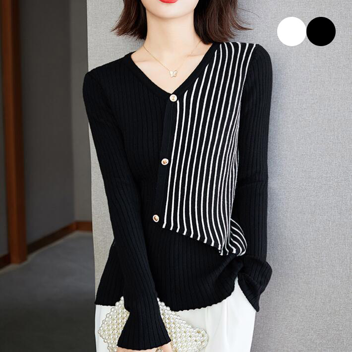 ニットセーターリブニットストライプタイトニット トップス Vネックセーター 長袖 レディースキレイめシンプル ストレッチホワイトブラック春秋