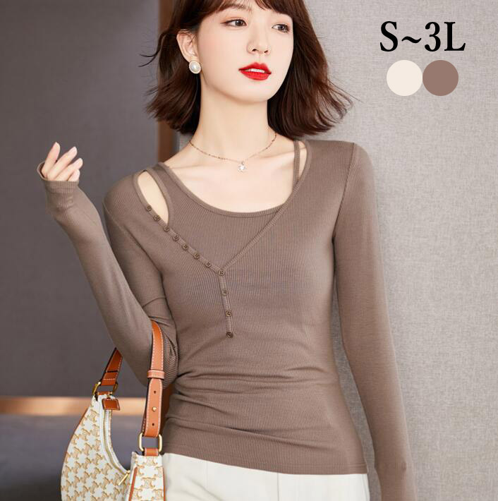ニットセータータイト切替トップス ネックネックシャツ長袖 レディースキレイめシンプル ストレッチ春秋フェミニンセクシー 23