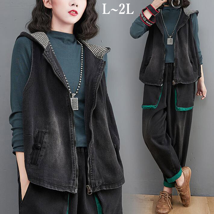 ベストデニムアウター ジャケットフード付きコートブラックウォッシュレディースノースリーブゆったり大きいサイズオーバーサイズ春秋L2L
