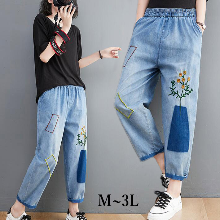 デニムパンツ刺繍花柄ウエストゴムジーンズ ジーパンゆるパンツユーズドネイビーウォッシュ レディース ボトムス ゴムロールアップ 9分丈 大きいサイズ美脚M L 2L 3L