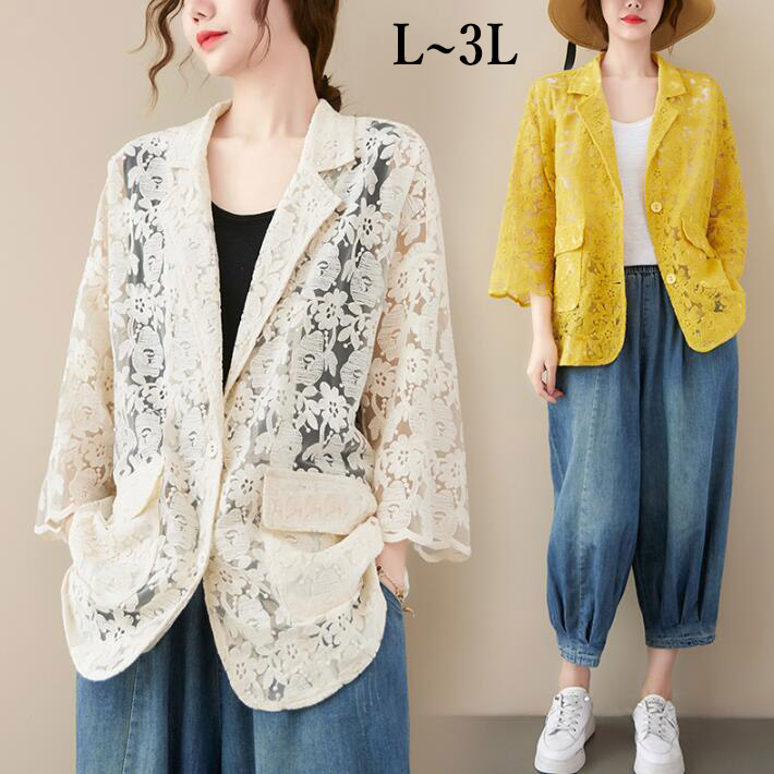 ライトアウター レースジャケット 花柄 刺繍レディース長袖 9分袖大きいサイズロング UV対策 紫外線対策 UVカット 冷房対策透けL 2L 3L