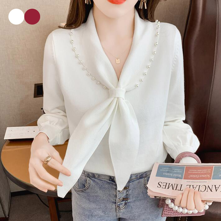 ニットレディースプルオーバーリボンセーターリブニットチュニック トップス 長袖 ニットソーキレイめパール シンプル 春秋