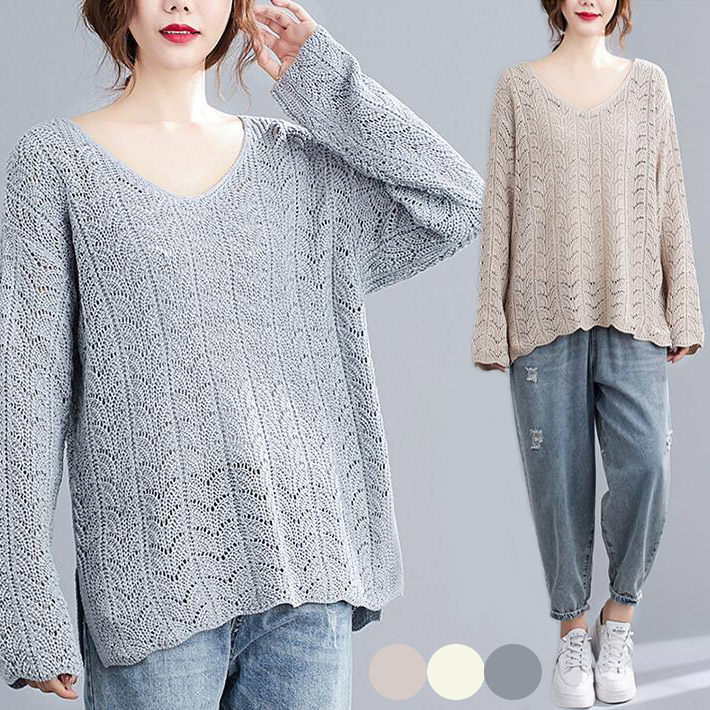 ニットかぎ編みサイトスリット透かし 透けVネック肌みせロング長袖重ね着ビックシルエット 体型カバーゆったり オーバーサイズレディース透け春秋