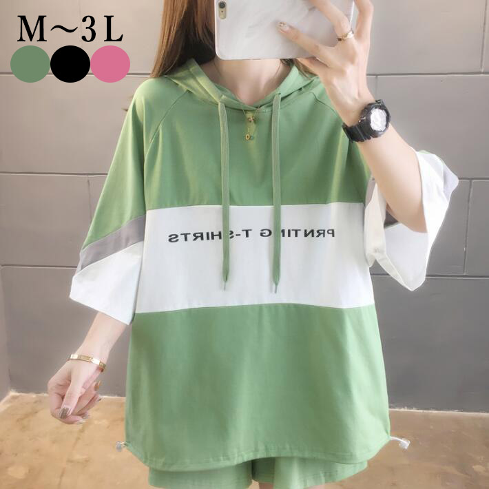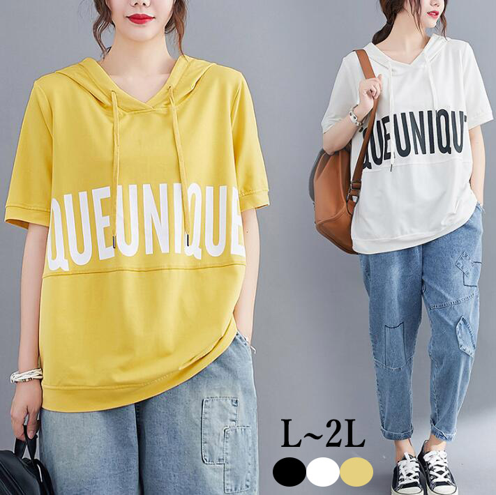 Tシャツフード付きロゴTシャツ オーバーサイズ ゆったりTシャツロンクTシャツ プリント プルオーバーロゴ半袖7分袖 大きいサイズビッグシルエット体型カバーカットソー夏L 2L